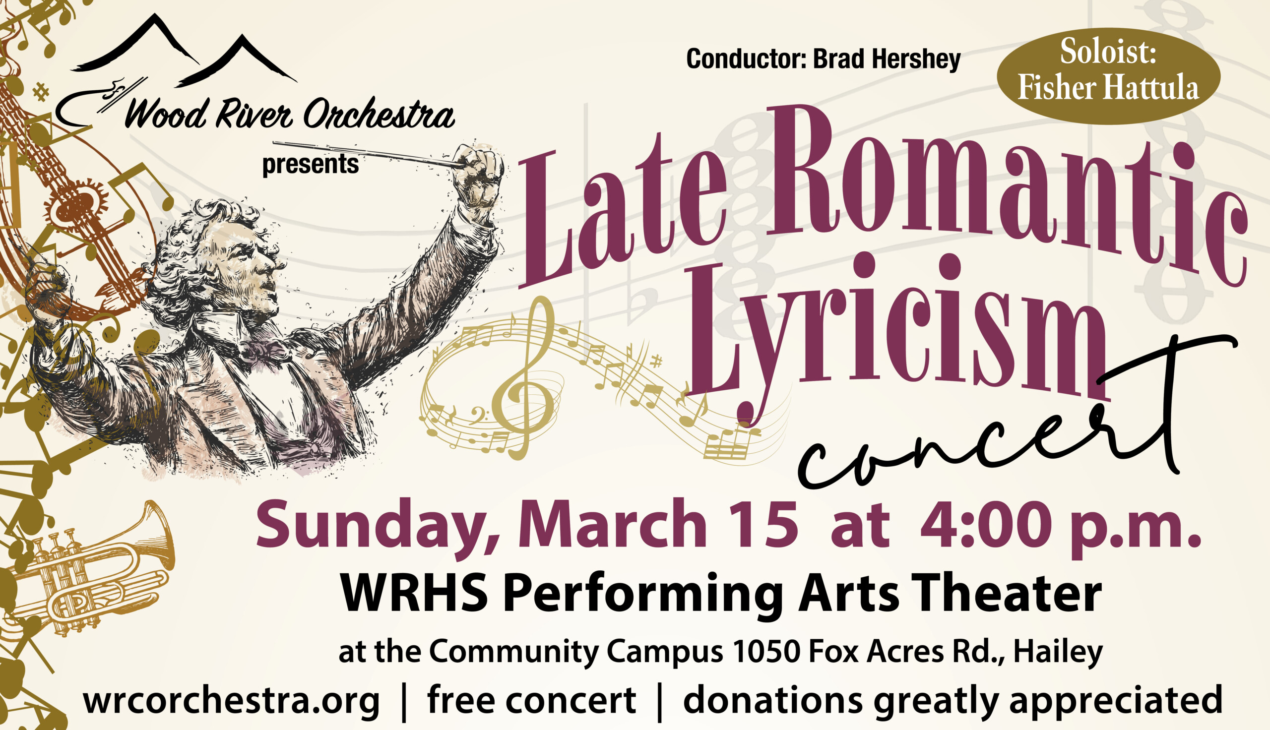 Our first concert of 2026 takes place on Sunday March 15, with a fascinating program of lush melodies and complex harmonies from the late romantic era – the late 19th and early 20th centuries. Johannes Brahms’ Academic Festival Overture showcases the German composer’s many talents: his classical precision combined with his lyrical romanticism. We are excited to present a concerto featuring WRHS senior Fisher Hattula, who is poised to continue his musical education at the post secondary level, but not before he joins us for Cecil Forsyth’s Viola Concerto. Written in the early 1900s, this piece by the British composer exploits the viola’s deep, rich tone to create a work of soulful beauty and virtuosic flair. Finally, American composer Samuel Barber’s Adagio for Strings, composed in 1936, has become one of the most beloved expressions of twentieth-century lyricism. Its restrained beauty and luminous sonorities invite listeners into a space of reflection, offering a timeless meditation on longing, loss, and the expressive power of song without words.